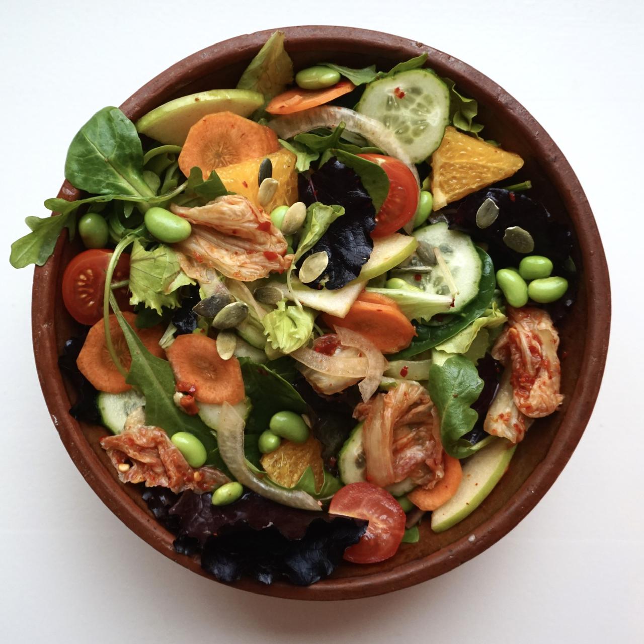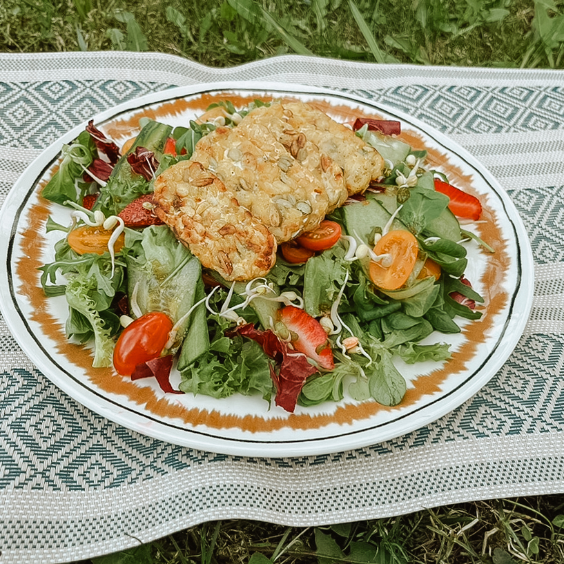 Värske salat kollase herne tempega