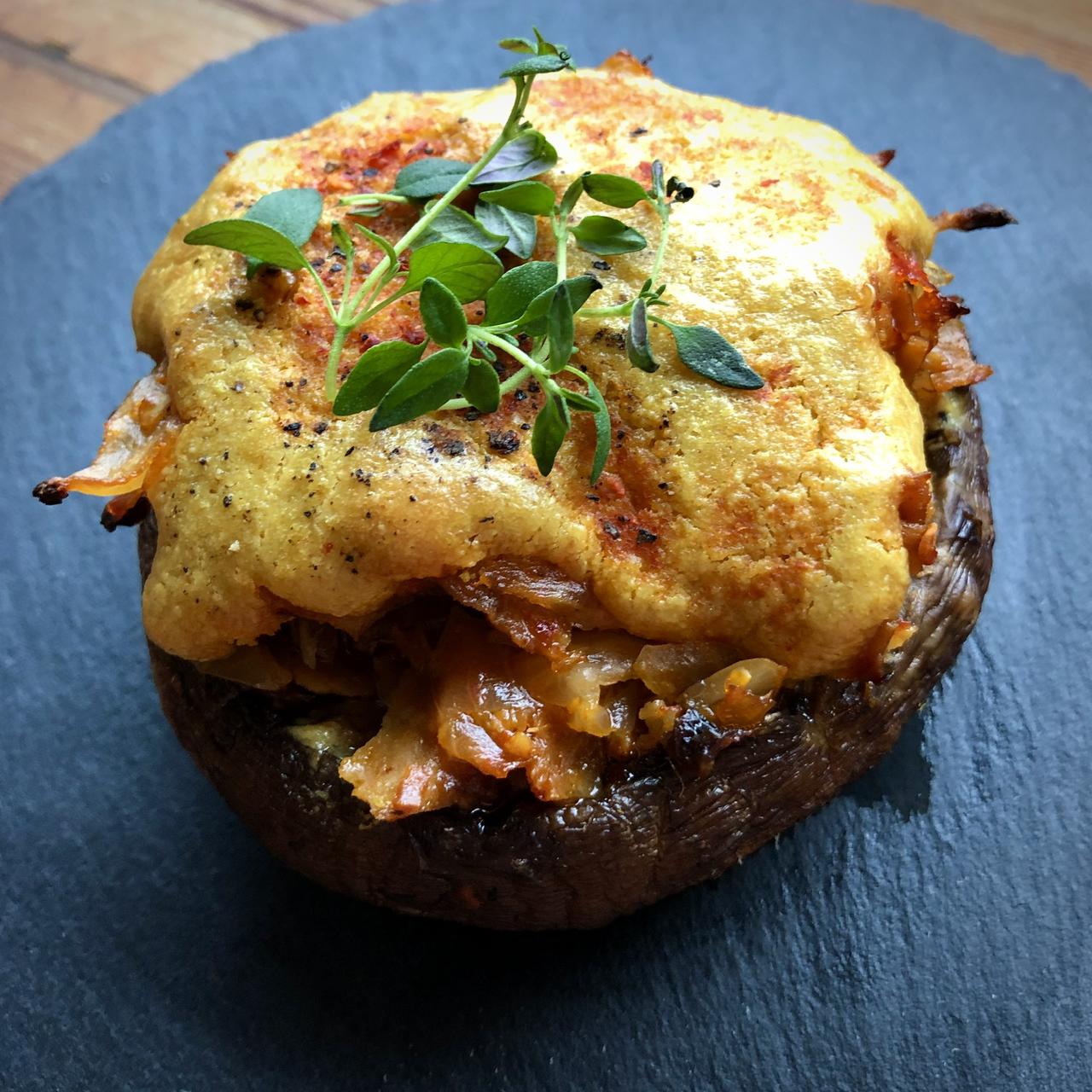Krimchi ja Vöneriga täidetud portobello seen inda pähkli "juustukastmega"